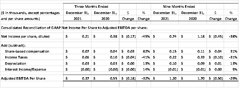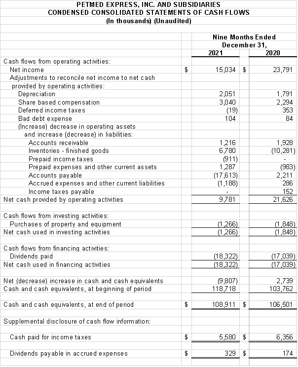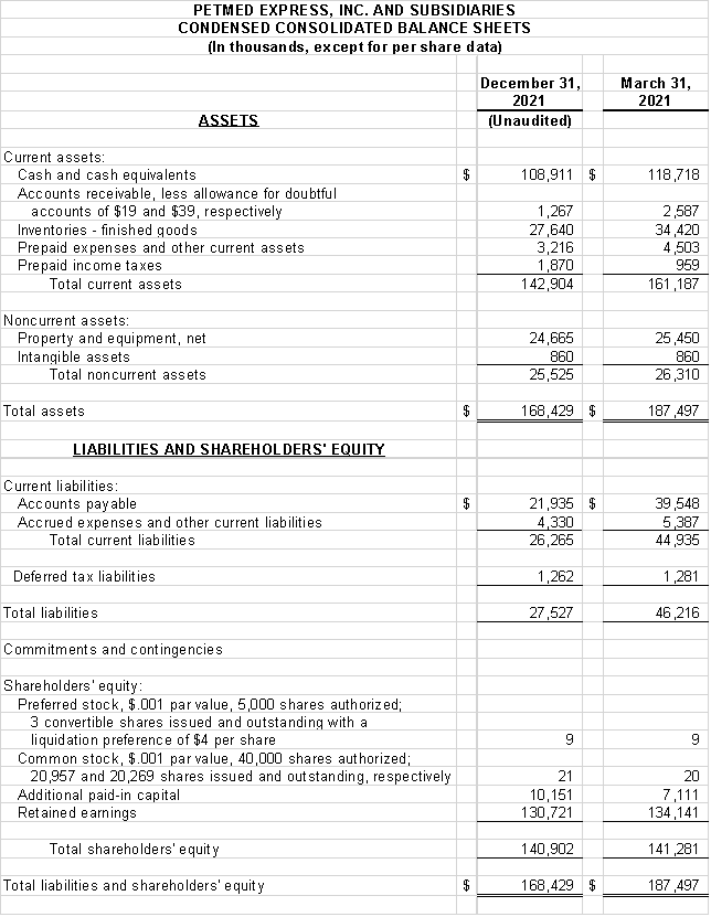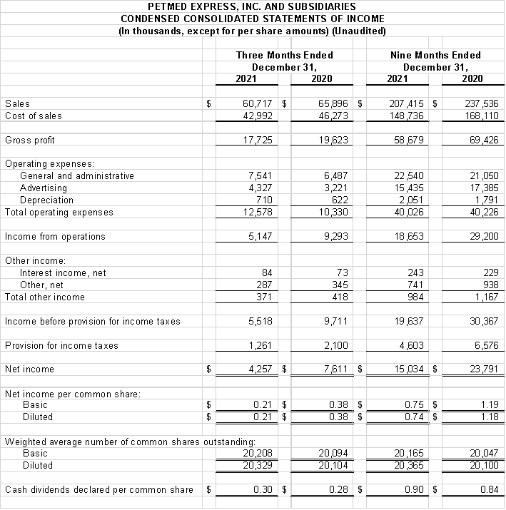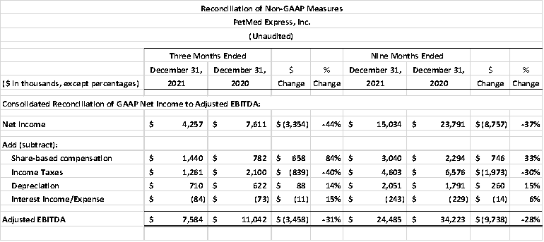 Delray Beach, Florida, January 24, 2022, PetMed Express, Inc. (NASDAQ: PETS) today announced its financial results for the quarter ended December 31, 2021. Net sales for the quarter ended December 31, 2021, were $60.7 million, compared to $65.9 million for the quarter ended December 31, 2020, a decrease of 7.9%. Net sales for the nine months ended December 31, 2021, were $207.4 million, compared to $237.5 million for the nine months ended December 31, 2020, a decrease of 12.7%. Net income was $4.3 million, or $0.21 diluted per share, for the quarter ended December 31, 2021, compared to net income of $7.6 million, or $0.38 diluted per share, for the quarter ended December 31, 2020, a 44% decrease to net income. Net income was $15.0 million, or $0.74 diluted per share, for the nine months ended December 31, 2021, compared to net income of $23.8 million, or $1.18 diluted per share, for the nine months ended December 31, 2020, a 37% decrease to net income. Adjusted EBITDA (1) was $7.6 million, or $0.37 diluted per share, for the quarter ended December 31, 2021, compared to adjusted EBITDA of $11.0 million, or $0.55 diluted per share, for the quarter ended December 31, 2020, a 31% decrease to adjusted EBITDA. Adjusted EBITDA was $24.5 million, or $1.20 diluted per share, for the nine months ended December 31, 2021, compared to adjusted EBITDA of $34.2 million, or $1.70 diluted per share, for the nine months ended December 31, 2020, a 28% decrease to adjusted EBITDA. Our average order size increased from $88 to $89 for the quarters ended December 31, 2020 and 2021, respectively.