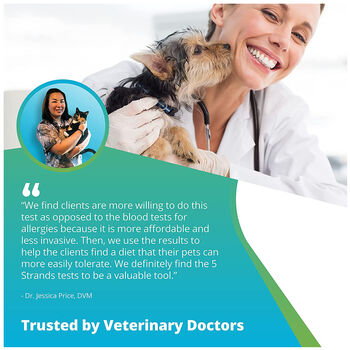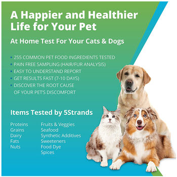 Pet Intolerance Test is an at-home allergy and intolerance test for cats and dogs. It can be used to detect intolerances to over 300 of the most common allergens, including proteins, seafood, fruits, veggies, insects, cleaning solutions, fabrics, plants, fungi, mold and more. Testing is done by 5Strands and results are sent via email 5-7 days after your sample arrives at the processing center.