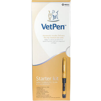 VETSULIN® VETPEN® Starter Kit is the world's first insulin pen designed specifically for use in cats and dogs with diabetes. Similar to human insulin pens, VetPen is an automatic insulin delivery pen that makes giving your pet insulin injections quicker, easier and more accurate. The VETSULIN® VETPEN® Starter Kit comes with a VetPen, 28 count package of VetPen Needles (12mm x 29G), a Travel Pouch, a Needle Remover, a Dose Selector Adaptor, and an instruction insert. VetPen 8 delivers 0.5 IU-8IU in 1/2 unit increments, and VetPen 16 delivers 1 IU-16 IU in 1 unit increments. VetPen can only be used with VetPen Needles. When needed, VetPen Needles (12mm x 29G) are available in a 100 count refill package (sold separately). The VetPen can only be used with the Vetsulin Insulin 2.7 ml cartridges (sold separately). Vetsulin Insulin (porcine insulin zinc suspension) treats diabetic dogs and cats by controlling the levels of glucose in the blood. Vetsulin Insulin requires refrigeration and must be kept at refrigerator temperatures at all times. VetPen requires a prescription from your veterinarian.