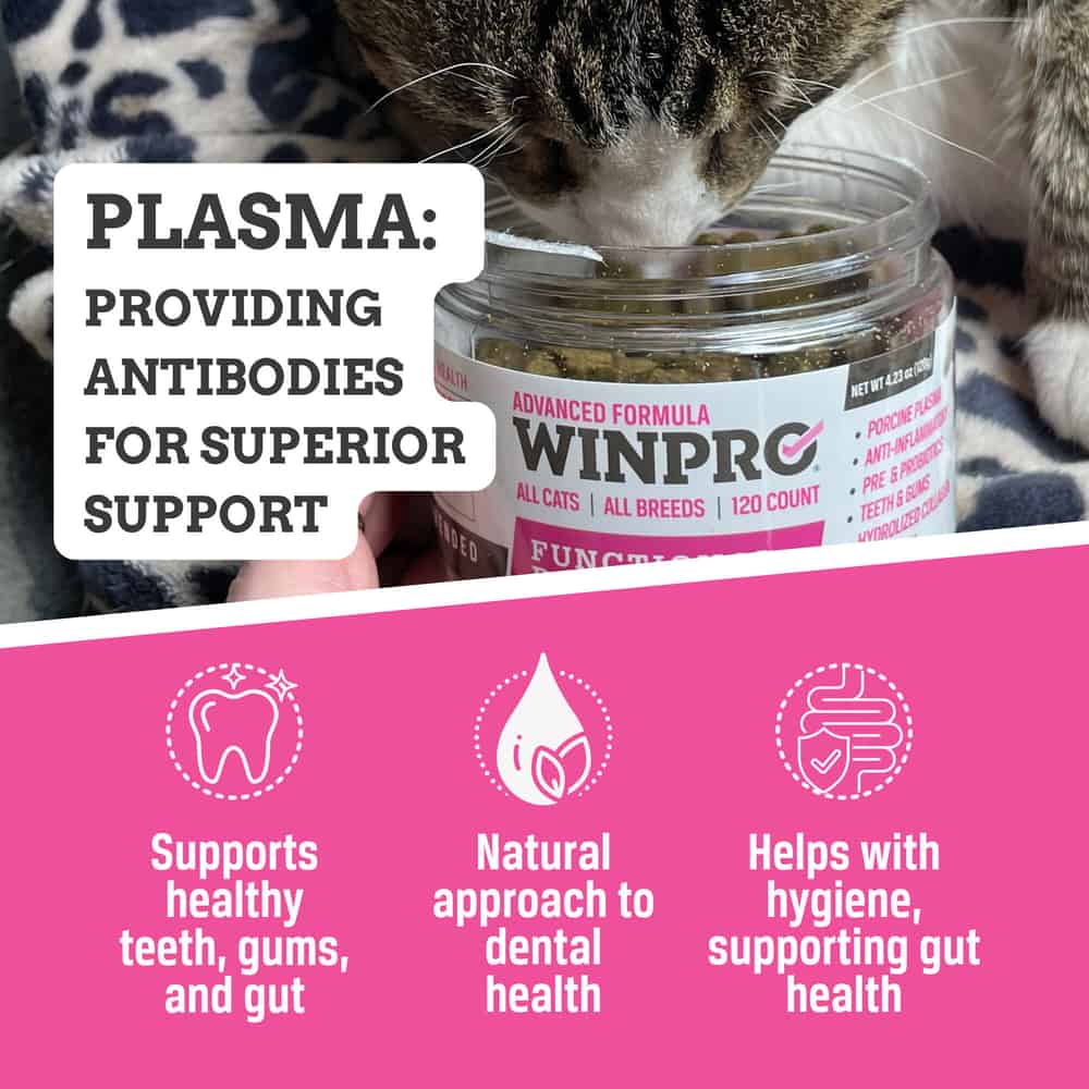 Winpro Pet Functional Dental Bites are specially formulated cat chews designed to support oral health and fresh breath. Made with bioactive plasma proteins and functional ingredients, these bites help reduce plaque and tartar buildup while promoting healthy gums. Perfect for daily use, they combine dental care with immune support for your cat's overall well-being.