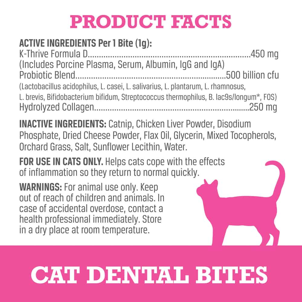 | Catnip, Chicken Liver Powder, Disodium Phosphate, Dried Cheese Powder, Flax Oil, Glycerin (Coconut), Mixed Tocopherols, Orchard Grass, Salt, Sunflower Lecithin, Water.Active Ingredients: K-Thrive™ Formula D (Includes Porcine Plasma, Serum, Albumin, IgG and IgA) and a Probiotic Blend. |