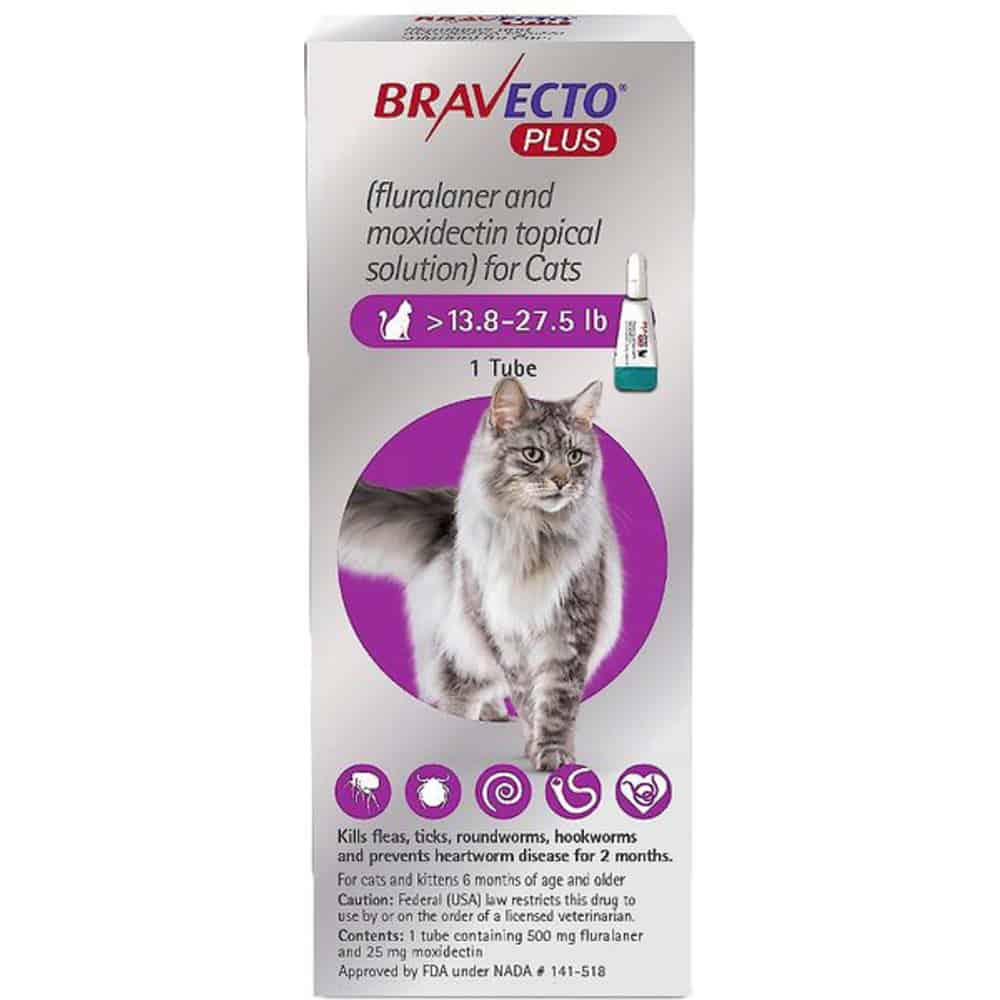 Bravecto Plus is applied topically to your cat's skin, where active ingredients Fluralaner and Moxidectin are absorbed into the bloodstream. Fluralaner kills flea and ticks when they feed on your cat. Moxidectin kills roundworms, hookworms and heartworms.