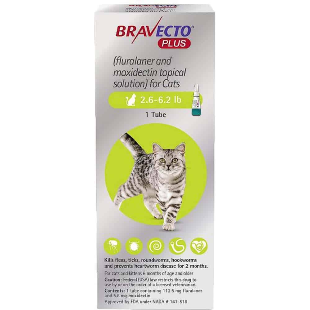 Bravecto Plus is applied topically to your cat's skin, where active ingredients Fluralaner and Moxidectin are absorbed into the bloodstream. Fluralaner kills flea and ticks when they feed on your cat. Moxidectin kills roundworms, hookworms and heartworms.