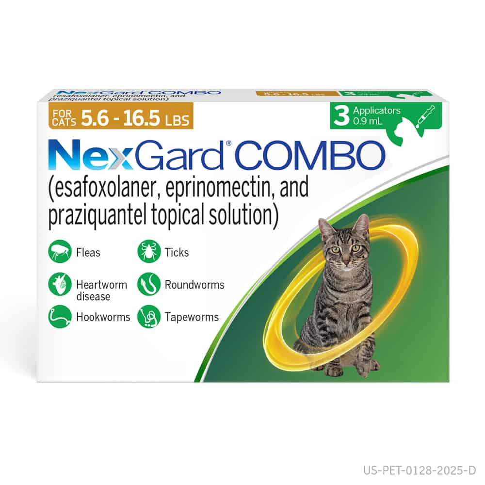 NexGard® COMBO is indicated for the prevention of heartworm disease caused by Dirofilaria immitis and for the treatment and control of roundworm (fourth stage larval and adult Toxocara cati), hookworm (fourth stage larval and adult Ancylostoma tubaeforme; adult Ancylostoma braziliense), and tapeworm (Dipylidium caninum) infections. NexGard® COMBO kills adult fleas (Ctenocephalides felis) and is indicated for the treatment and prevention of flea infestations and the treatment and control of Ixodes scapularis (black-legged tick) and Amblyomma americanum (lone star tick) infestations for one month in cats and kittens 8 weeks of age and older, and weighing 1.8 lbs or greater.