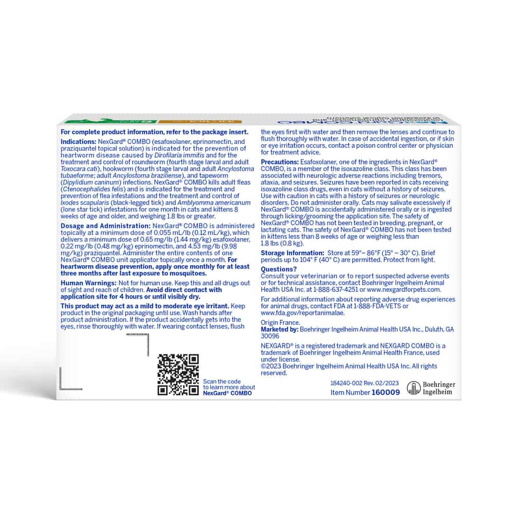 NexGard® COMBO topical solution contains three active ingredients (esafoxolaner, eprinomectin and praziquantel) to protect against fleas, ticks, heartworm disease, roundworms, hookworms and tapeworms in cats and kittens 8 weeks of age and older and weighing 1.8 lbs. or greater.