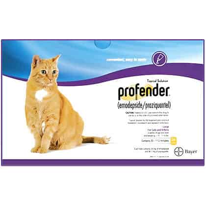 Profender Cat Dewormer is a prescription-required topical solution that is FDA-approved for the treatment and control of hookworm, roundworm, and tapeworm infections in cats 8 weeks of age and older and weighing at least 2.2 lbs. Profender Cat Dewormer is packaged in single unit dosing applicator tubes and is available as 0.35 ml tubes containing emodepside 7.5 mg and praziquantel 30 mg for use on cats 2.2-5.5 lbs, 0.70 ml tubes containing emodepside 15 mg and praziquantel 60.1 mg for use on cats 5.6-11 lbs, and 1.12 ml tubes containing emodepside 24 mg and praziquantel 96.1 mg for use on cats 11.1-17.6 lbs. For cats over 17.6 lbs, the appropriate combination of tubes should be used.