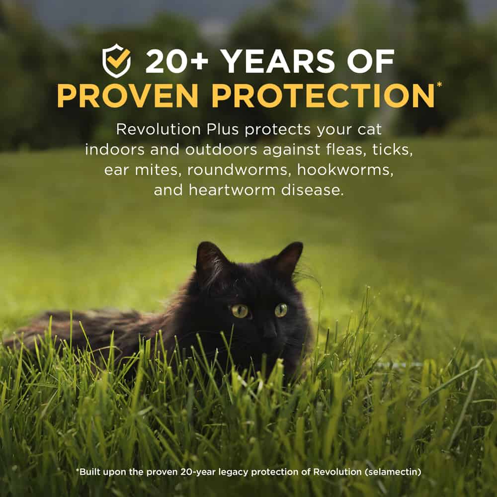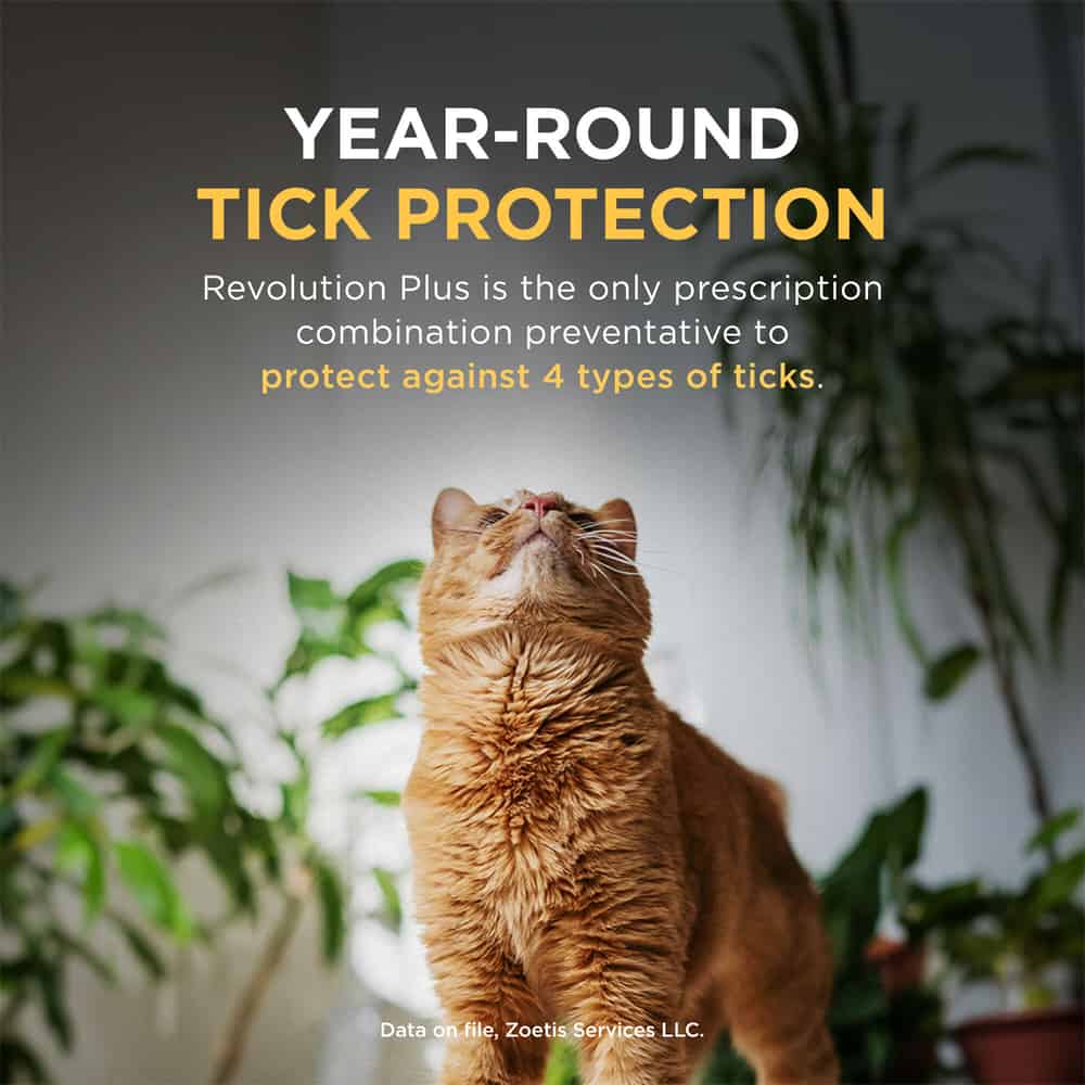 Revolution Plus is a topical medication for cats that is applied topically once a month. Revolution Plus provides 7-in-1 protection against adult fleas, ticks (Lone Star tick, Black-legged or Deer tick, Gulf Coast tick, and American dog tick), heartworms, ear mites, roundworms, and hookworms. It also prevents flea tapeworms (Dipylidium caninum) by killing fleas. In humans, Revolution Plus may be irritating to skin and eyes. Make sure to wash your hands after application.