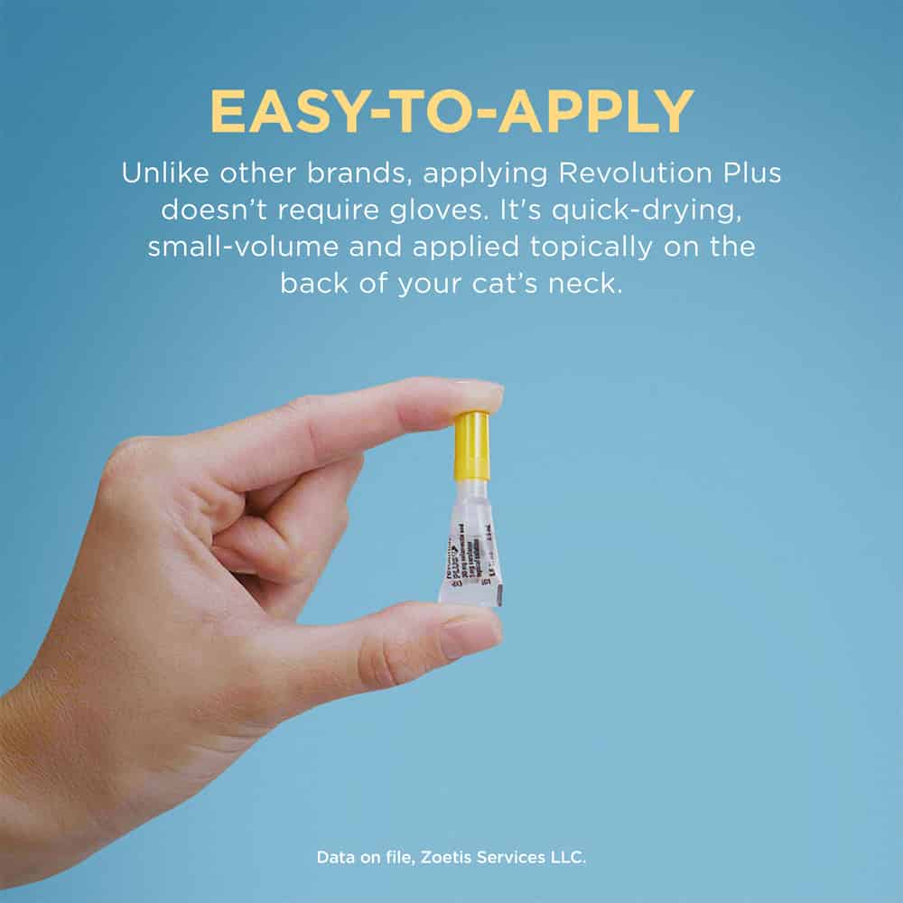 Apply Revolution Plus for Cats exactly as directed by your veterinarian, on a monthly basis. Revolution Plus for Cats comes in single-use tubes for easy administration. Press the cap down to puncture the seal on the tube. A clicking sound will confirm the seal has been punctured. Remove the cap and make sure the tip of the tube is open. To administer, part the hair on the back of your cat at the base of the neck in front of the shoulder blades until the skin is visible. Place the tip of the tube on the skin and empty the contents of the tube in one spot. Do not massage the product into the skin or apply to broken skin. Additionally, don't apply if your cat's coat is wet. Avoid contact between the product and your fingers. Wash your hands when you have finished applying Revolution Plus for Cats to your cat.