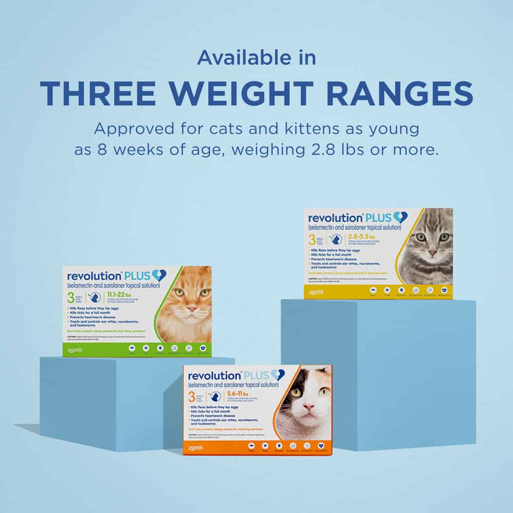 IMPORTANT SAFETY INFORMATION: Revolution Plus has not been evaluated as safe to use for kittens less than 8 weeks of age, underweight animals, or in breeding, pregnant, or lactating cats. Reported side effects in clinical trials included lethargy, weight loss, and anorexia. Use with caution in cats with a history of neurologic disorders. Revolution Plus contains sarolaner, which has been associated with adverse drug experiences and neurologic reactions including tremors, ataxia, and seizures in cats with or without a history of neurologic disorders. In humans, Revolution Plus may be irritating to skin and eyes.