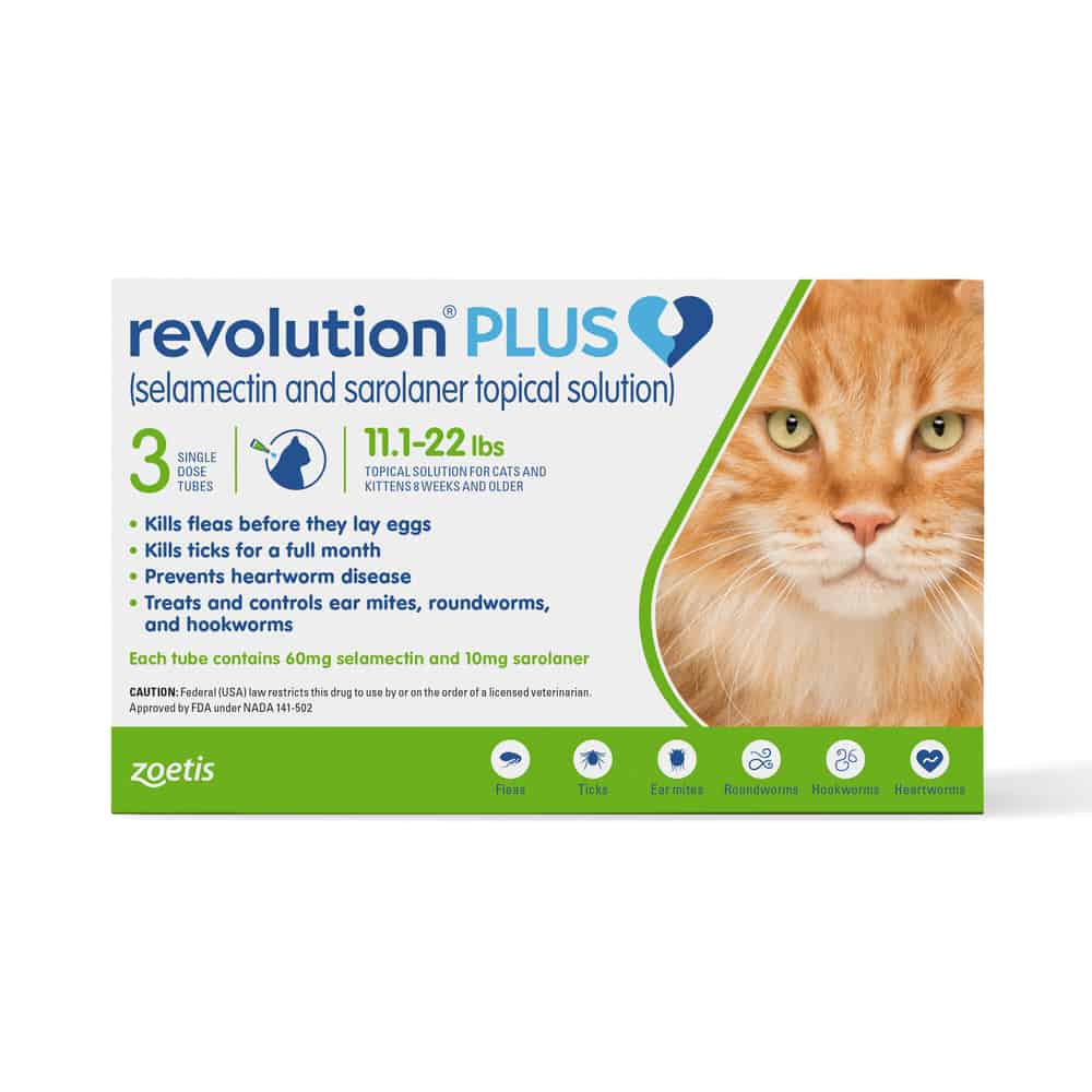 Revolution Plus is a topical medication for cats that is applied topically once a month. Revolution Plus provides 7-in-1 protection against adult fleas, ticks (Lone Star tick, Black-legged or Deer tick, Gulf Coast tick, and American dog tick), heartworms, ear mites, roundworms, and hookworms. It also prevents flea tapeworms (Dipylidium caninum) by killing fleas. In humans, Revolution Plus may be irritating to skin and eyes. Make sure to wash your hands after application.
