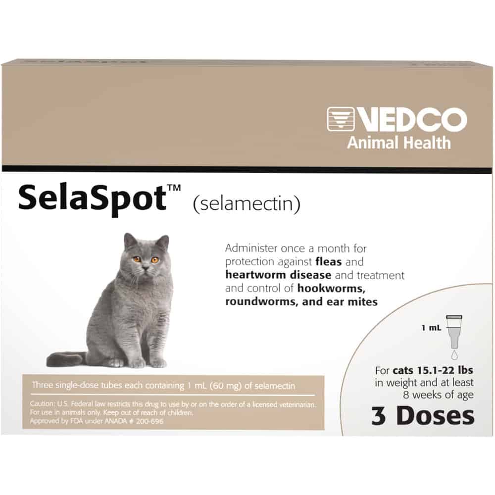 SelaSpot (selamectin) Topical Parasiticide is available as a colorless to yellow, ready to use solution in single dose tubes for topical (dermal) treatment of cats eight weeks of age and older. The content of each tube is formulated to provide a minimum of 2.7 mg/lb (6 mg/kg) of body weight of selamectin. SelaSpot™ (selamectin) is a prescription-only medication that provides a full month of 'all-in-one' protection against both internal and external parasites.