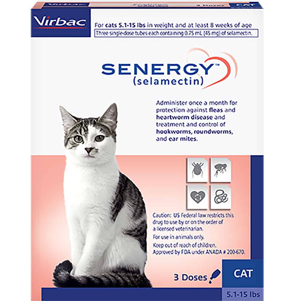Senergy is indicated for the treatment and prevention of flea infestations, roundworm, hookworm, heartworm, and ear mites. Senergy requires a prescription from your veterinarian. Senergy is for dogs 6 weeks of age or older and cats 8 weeks of age or older.
