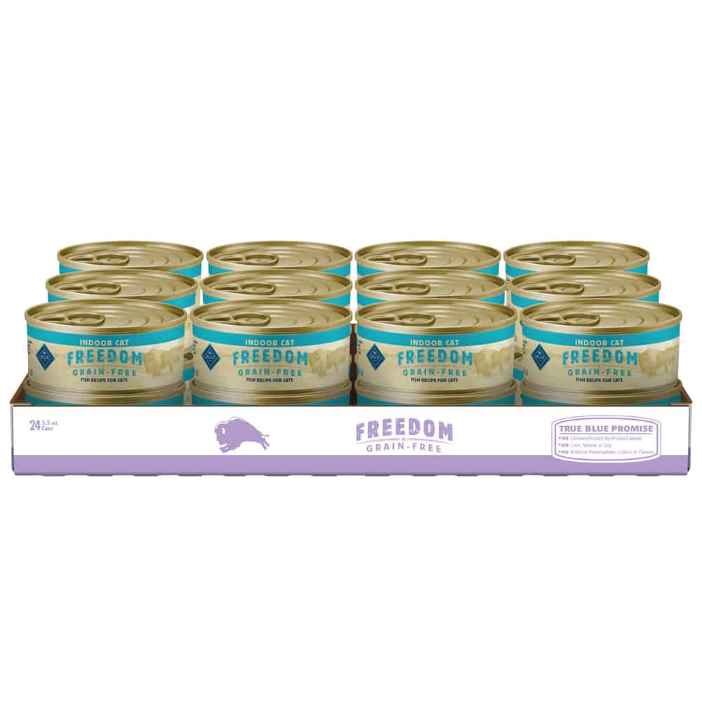 BLUE Freedom canned food is formulated to meet the needs of indoor cats, with none of the grains that contain gluten.