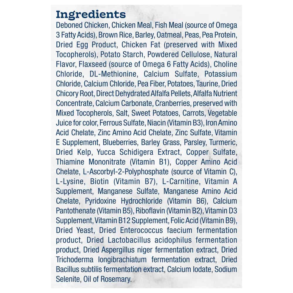 | Ingredients: Deboned Chicken, Chicken Meal, Menhaden Fish Meal (source of Omega 3 Fatty Acids), Brown Rice, Barley, Oatmeal, Peas, Pea Protein, Dried Egg Product, Chicken Fat (preserved with Mixed Tocopherols), Potato Starch, Powdered Cellulose, Natural Flavor, Flaxseed (source of Omega 6 Fatty Acids), Choline Chloride, DL-Methionine, Calcium Sulfate, Potassium Chloride, Calcium Chloride, Pea Fiber, Potatoes, Taurine, Dried Chicory Root, Dehydrated Alfalfa Meal, Alfalfa Nutrient Concentrate, Calcium Carbonate, Cranberries, preserved with Mixed Tocopherols, Salt, Sweet Potatoes, Carrots, Vegetable Juice for color, Ferrous Sulfate, Niacin (Vitamin B3), Iron Amino Acid Chelate, Zinc Amino Acid Chelate, Zinc Sulfate, Vitamin E Supplement, Blueberries, Barley Grass, Parsley, Turmeric, Dried Kelp, Yucca Schidigera Extract, Copper Sulfate, Thiamine Mononitrate (Vitamin B1), Copper Amino Acid Chelate, L-Ascorbyl-2-Polyphosphate (source of Vitamin C), L-Lysine, Biotin (Vitamin B7), L-Carnitine, Vitamin A Supplement, Manganese Sulfate, Manganese Amino Acid Chelate, Pyridoxine Hydrochloride (Vitamin B6), Calcium Pantothenate (Vitamin B5), Riboflavin (Vitamin B2), Vitamin D3 Supplement, Vitamin B12 Supplement, Folic Acid (Vitamin B9), Dried Yeast, Dried Enterococcus faecium fermentation product, Dried Lactobacillus acidophilus fermentation product, Dried Aspergillus niger fermentation extract, Dried Trichoderma longibrachiatum fermentation extract, Dried Bacillus subtilis fermentation extract, Calcium Iodate, Sodium Selenite, Oil of Rosemary. | |