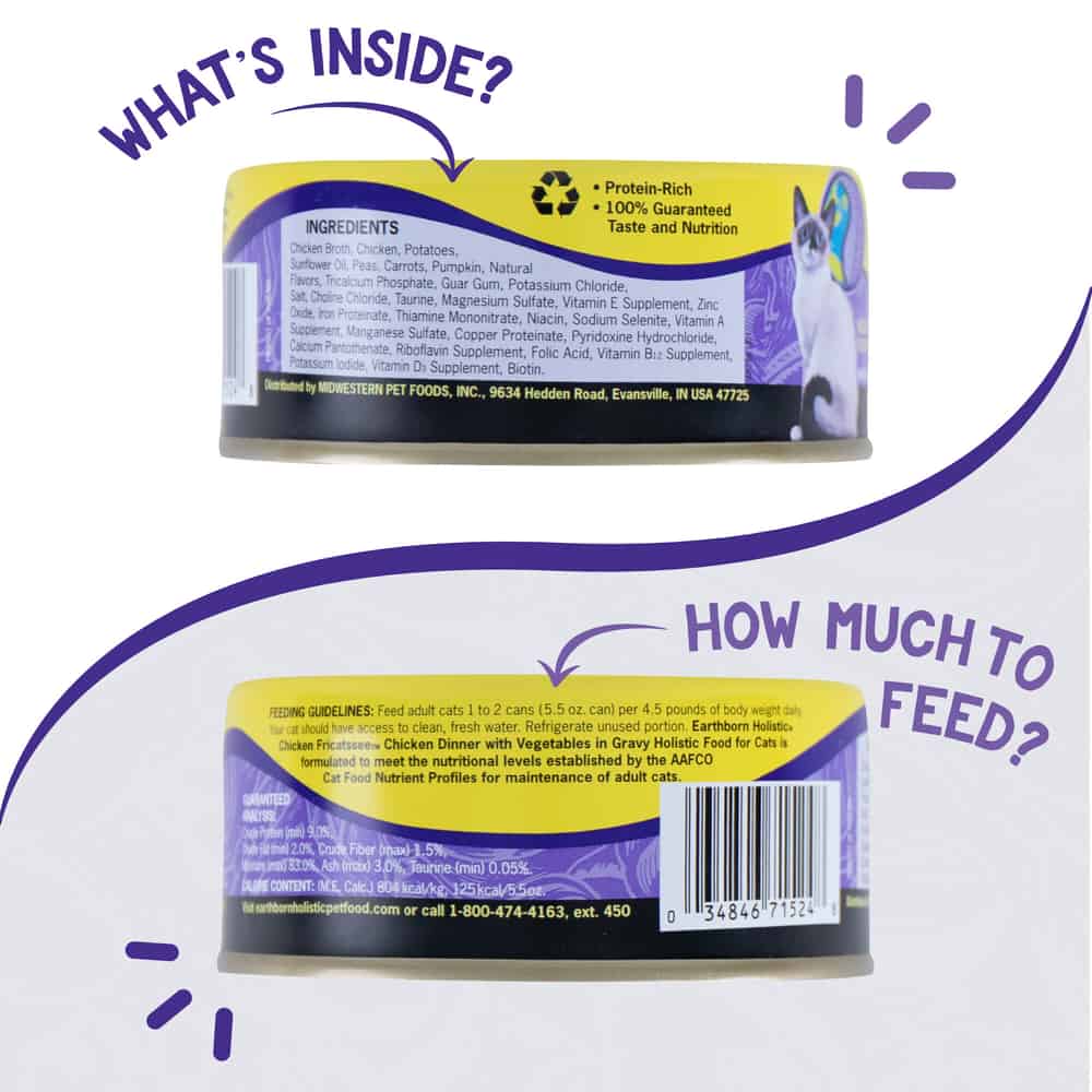 | Earthborn Holistic Chicken Fricatssee Chicken Dinner with Vegetables in Gravy is formulated to meet the nutritional levels established by the AAFCO Cat Food Nutrient Profiles for adult maintenance. |