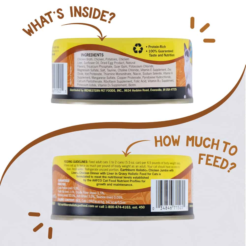 | Earthborn Holistic Chicken Jumble with Liver Chicken Dinner with Liver in Gravy is formulated to meet the nutritional levels established by the AAFCO Cat Food Nutrient Profiles for growth and maintenance. |