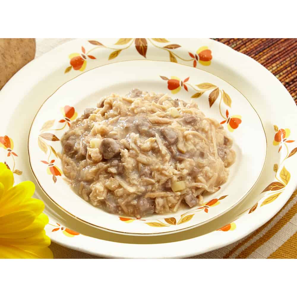 | Chicken Broth, Chicken, Potatoes, Chicken Liver, Sunflower Oil, Dried Egg Product, Natural Flavors, Tricalcium Phosphate, Guar Gum, Potassium Chloride, Magnesium Sulfate, Salt, Taurine, Choline Chloride, Vitamin E Supplement, Zinc Oxide, Iron Proteinate, Thiamine Mononitrate, Niacin, Sodium Selenite, Vitamin A Supplement, Manganese Sulfate, Copper Proteinate, Pyridoxine Hydrochloride, Calcium Pantothenate, Riboflavin Supplement, Folic Acid, Vitamin B12 Supplement, Potassium Iodide, Vitamin D3 Supplement, Biotin. |