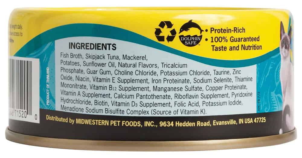 | Fish Broth, Skipjack Tuna, Mackerel, Potatoes, Sunflower Oil, Natural Flavors, Tricalcium Phosphate, Guar Gum, Choline Chloride, Potassium Chloride, Taurine, Zinc Oxide, Niacin, Vitamin E Supplement, Iron Proteinate, Sodium Selenite, Thiamine Mononitrate, Vitamin B12 Supplement, Manganese Proteinate, Copper Proteinate, Vitamin A Supplement, Calcium Pantothenate, Riboflavin Supplement, Pyridoxine Hydrochloride, Biotin, Vitamin D3 Supplement, Folic Acid, Potassium Iodide, Menadione Sodium Bisulfite Complex (Source of Vitamin K). |