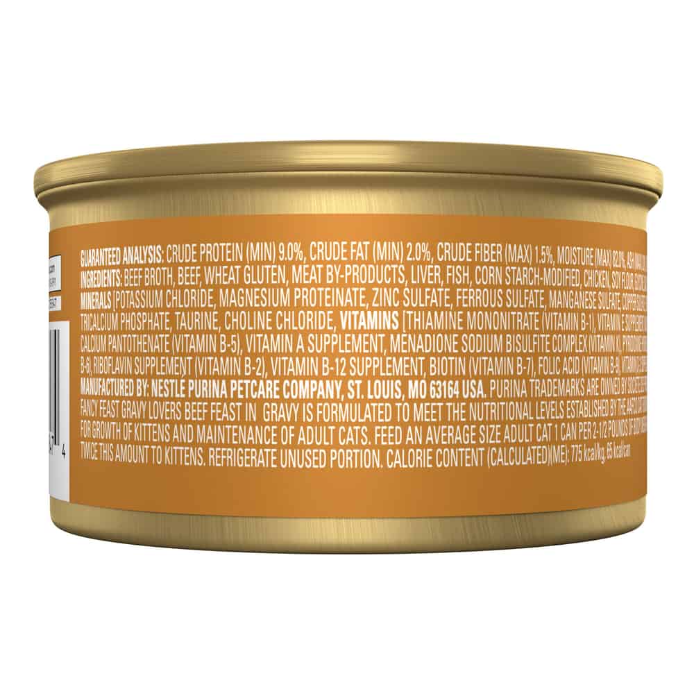 - Fancy Feast Gravy Lovers Beef Wet Cat Food is formulated to meet the nutritional levels established by the AAFCO Cat Food Nutrient Profiles for all life stages.