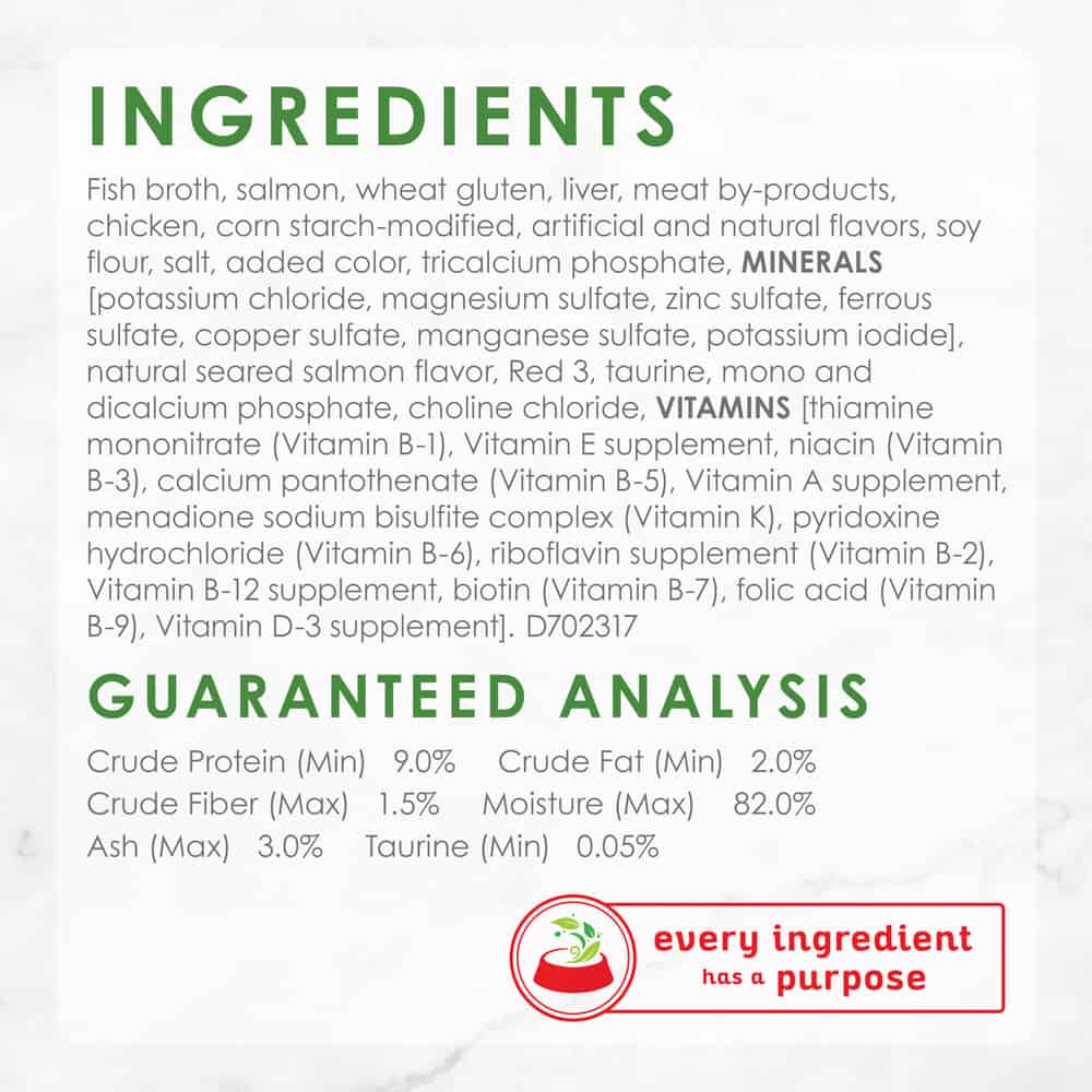 | Ingredients: Fish Broth, Salmon, Wheat Gluten, Liver, Meat By-Products, Chicken, Corn Starch-Modified, Artificial And Natural Flavors, Soy Flour, Salt, Added Color, Tricalcium Phosphate, Minerals (Potassium Chloride, Magnesium Sulfate, Zinc Sulfate, Ferrous Sulfate, Copper Sulfate, Manganese Sulfate, Potassium Iodide), Natural Seared Salmon Flavor, Red 3, Taurine, Mono And Dicalcium Phosphate, Choline Chloride, Vitamins (Thiamin Mononitrate [Vitamin B-1], Vitamin E Supplement, Niacin [Vitamin B-3], Calcium Pantothenate [Vitamin B-5], Vitamin A Supplement, Menadione Sodium Bisulfite Complex [Vitamin K], Pyridoxine Hydrochloride [Vitamin B-6], Riboflavin Supplement [Vitamin B-2], Vitamin B-12 Supplement, Biotin [Vitamin B-7], Folic Acid [Vitamin B-9], Vitamin D-3 Supplement). D702317. |