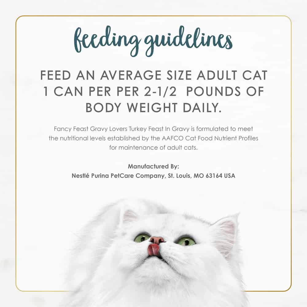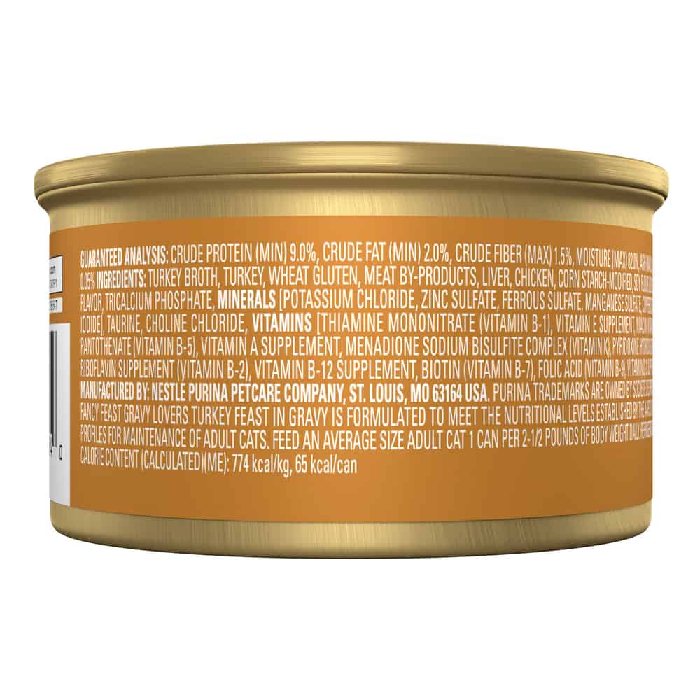 - Fancy Feast Gravy Lovers Turkey Wet Cat food is formulated to meet the nutritional levels established by the AAFCO Cat Food Nutrient Profiles for maintenance of adult cats.