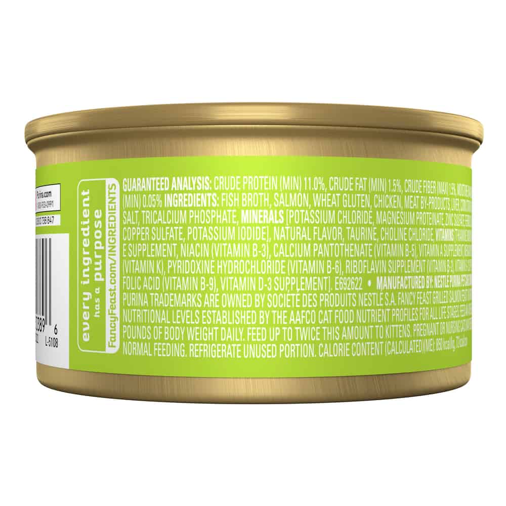 - Fancy Feast Grilled Salmon Feast In Gravy is formulated to meet the nutritional levels established by the AAFCO Cat Food Nutrient Porfiles for maintenance of adult cats.