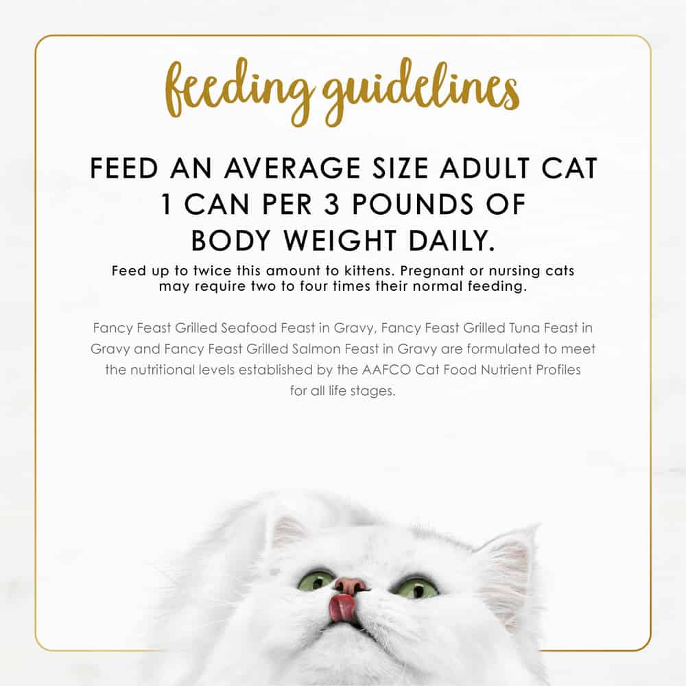 - Fancy Feast Grilled Seafood Feast in Gravy, Fancy Feast Grilled Tuna Feast in Gravy, and Fancy Feast Grilled Salmon Feast are formulated to meet the nutritional levels established by the AAFCO Cat Food Nutrient Profiles for all life stages.