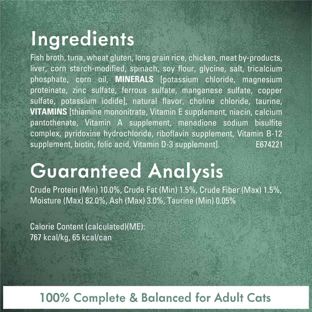 | Ingredients: Fish Broth, Tuna, Wheat Gluten, Long Grain Rice, Chicken, Meat By-Products, Liver, Corn Starch-Modified, Spinach, Soy Flour, Glycine, Salt, Tricalcium Phosphate, Corn Oil, MINERALS [Potassium Chloride, Magnesium Proteinate, Zinc Sulfate, Ferrous Sulfate, Manganese Sulfate, Copper Sulfate, Potassium Iodide], Natural Flavor, Choline Chloride, Taurine, VITAMINS [Thiamine Mononitrate, Vitamin E Supplement, Niacin, Calcium Pantothenate, Vitamin A Supplement, Menadione Sodium Bisulfite Complex, Pyridoxine Hydrochloride, Riboflavin Supplement, Vitamin B-12 Supplement, Biotin, Folic Acid, Vitamin D-3 Supplement]. E674221 |