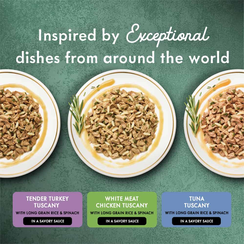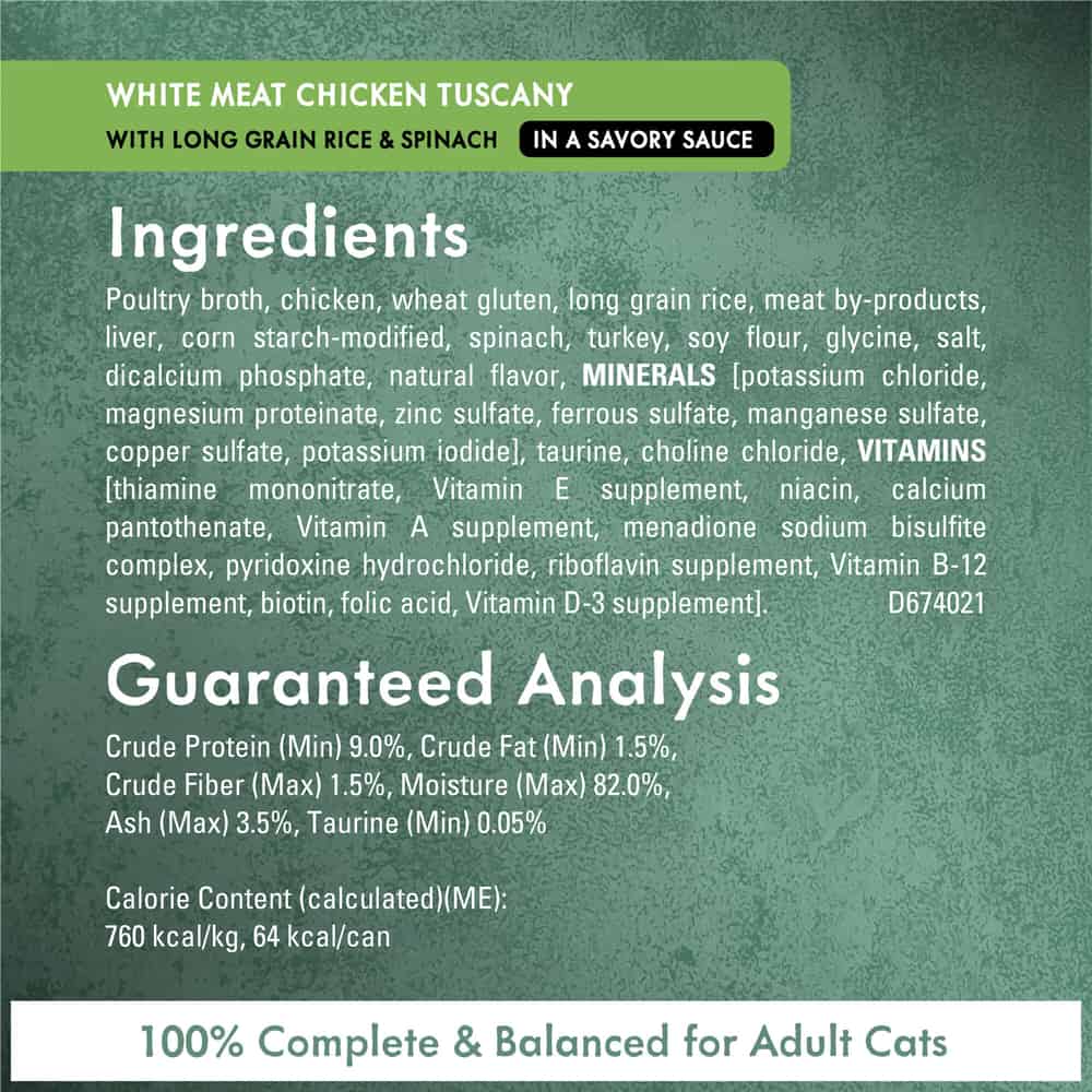 | Ingredients: White Meat Chicken Tuscany: Poultry Broth, Chicken, Wheat Gluten, Long Grain Rice, Meat By-Products, Liver, Corn Starch-Modified, Spinach, Turkey, Soy Flour, Glycine, Salt, Dicalcium Phosphate, Natural Flavor, MINERALS (Potassium Chloride, Magnesium Proteinate, Zinc Sulfate, Ferrous Sulfate, Manganese Sulfate, Copper Sulfate, Potassium Iodide), Taurine, Choline Chloride, VITAMINS (Thiamine Mononitrate, Vitamin E Supplement, Niacin, Calcium Pantothenate, Vitamin A Supplement, Menadione Sodium Bisulfite Complex, Pyridoxine Hydrochloride, Riboflavin Supplement, Vitamin B-12 Supplement, Biotin, Folic Acid, Vitamin D-3 Supplement). D674021. Tender Turkey Tuscany: Poultry Broth, Turkey, Wheat Gluten, Meat By-Products, Liver, Long Grain Rice, Corn Starch-Modified, Spinach, Soy Flour, Glycine, Salt, Natural Flavor, MINERALS (Potassium Chloride, Zinc Sulfate, Ferrous Sulfate, Manganese Sulfate, Copper Sulfate, Potassium Iodide), Corn Oil, Tricalcium Phosphate, Taurine, Choline Chloride, VITAMINS (Thiamine Mononitrate, Vitamin E Supplement, Niacin, Calcium Pantothenate, Vitamin A Supplement, Menadione Sodium Bisulfite Complex, Pyridoxine Hydrochloride, Riboflavin Supplement, Vitamin B-12 Supplement, Biotin, Folic Acid, Vitamin D-3 Supplement). D674321. Tuna Tuscany: Fish Broth, Tuna, Wheat Gluten, Long Grain Rice, Chicken, Meat By-Products, Liver, Corn Starch-Modified, Spinach, Soy Flour, Glycine, Salt, Tricalcium Phosphate, Corn Oil, MINERALS (Potassium Chloride, Magnesium Proteinate, Zinc Sulfate, Ferrous Sulfate, Manganese Sulfate, Copper Sulfate, Potassium Iodide), Natural Flavor, Choline Chloride, Taurine, VITAMINS (Thiamine Mononitrate, Vitamin E Supplement, Niacin, Calcium Pantothenate, Vitamin A Supplement, Menadione Sodium Bisulfite Complex, Pyridoxine Hydrochloride, Riboflavin Supplement, Vitamin B-12 Supplement, Biotin, Folic Acid, Vitamin D-3 Supplement). E674221 |