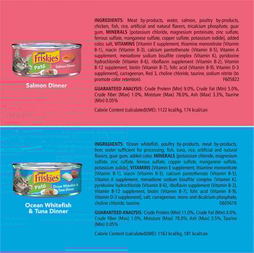 | Meat By-products, Water, Salmon, Poultry By-products, Chicken, Fish, Rice, Artificial And Natural Flavors, Tricalcium Phosphate, Guar Gum, Minerals [Potassium Chloride, Magnesium Proteinate, Zinc Sulfate, Ferrous Sulfate, Manganese Sulfate, Copper Sulfate, Potassium Iodide], Added Color, Salt, Vitamins [Vitamin E Supplement, Thiamine Mononitrate (Vitamin B-1), Niacin (Vitamin B-3), Calcium Pantothenate (Vitamin B-5), Vitamin A Supplement, Menadione Sodium Bisulfite Complex (Vitamin K), Pyridoxine Hydrochloride (Vitamin B-6), Riboflavin Supplement (Vitamin B-2), Vitamin B-12 Supplement, Biotin (Vitamin B-7), Folic Acid (Vitamin B-9), Vitamin D-3 Supplement], Carrageenan, Red 3, Choline Chloride, Taurine, Sodium Nitrite (To Promote Color Retention).F605822 |