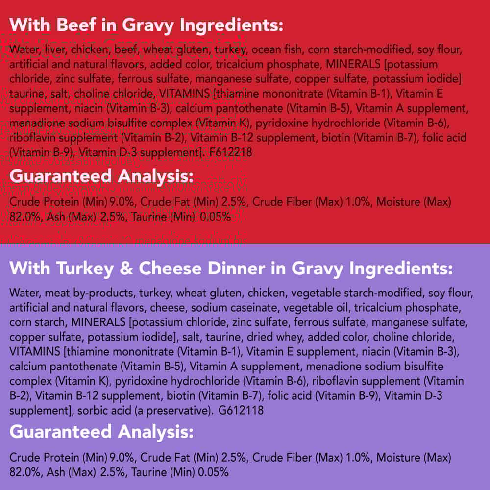 | Water, Liver, Chicken, Beef, Wheat Gluten, Turkey, Ocean Fish, Corn Starch-Modified, Soy Flour, Artificial And Natural Flavors, Added Color, Tricalcium Phosphate, Minerals [Potassium Chloride, Zinc Sulfate, Ferrous Sulfate, Manganese Sulfate, Copper Sulfate, Potassium Iodide] Taurine, Salt, Choline Chloride, Vitamins [Thiamine Mononitrate (Vitamin B-1), Vitamin E Supplement, Niacin (Vitamin B-3), Calcium Pantothenate (Vitamin B-5), Vitamin A Supplement, Menadione Sodium Bisulfite Complex (Vitamin K), Pyridoxine Hydrochloride (Vitamin B-6), Riboflavin Supplement (Vitamin B-2), Vitamin B-12 Supplement, Biotin (Vitamin B-7), Folic Acid (Vitamin B-9), Vitamin D-3 Supplement]. F612218 |