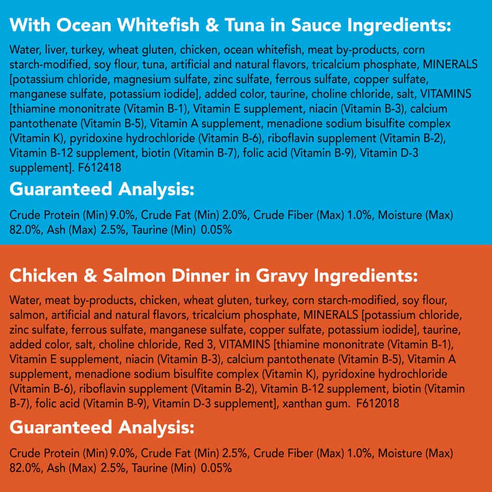 | Water, Liver, Turkey, Wheat Gluten, Chicken, Ocean Whitefish, Meat By-Products, Corn Starch-Modified, Soy Flour, Tuna, Artificial And Natural Flavors, Tricalcium Phosphate, Minerals [Potassium Chloride, Magnesium Sulfate, Zinc Sulfate, Ferrous Sulfate, Copper Sulfate, Manganese Sulfate, Potassium Iodide], Added Color, Taurine, Choline Chloride, Salt, Vitamins [Thiamine Mononitrate (Vitamin B-1), Vitamin E Supplement, Niacin (Vitamin B-3), Calcium Pantothenate (Vitamin B-5), Vitamin A Supplement, Menadione Sodium Bisulfite Complex (Vitamin K), Pyridoxine Hydrochloride (Vitamin B-6), Riboflavin Supplement (Vitamin B-2), Vitamin B-12 Supplement, Biotin (Vitamin B-7), Folic Acid (Vitamin B-9), Vitamin D-3 Supplement]. F612418 |