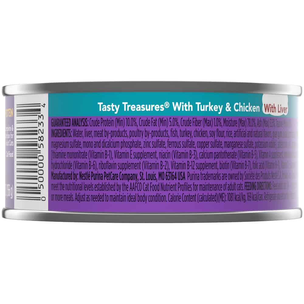 Celebrate your cat's love of poultry goodness with Purina Friskies Tasty Treasures With Liver, Turkey, and Chicken Pate wet cat food. This delectable recipe features a combination of liver, turkey, and chicken flavors that cats crave. The smooth pate texture pleases their palate, and the rich aroma serves as a signal that something delicious awaits them at mealtime. Let them delight in the sensational flavor combination found in every can, and rest easy knowing they're getting a high-quality meal every time you fill their dish with this Purina Friskies Tasty Treasures recipe.