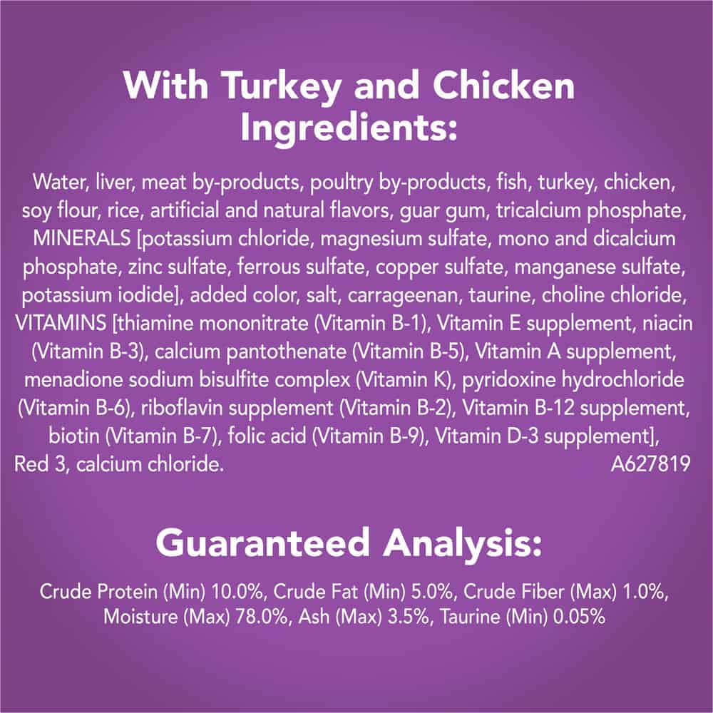 | Water, Liver, Meat By-products, Poultry By-products, Fish, Turkey, Chicken, Soy Flour, Rice, Artificial And Natural Flavors, Guar Gum, Tricalcium Phosphate, Minerals [Potassium Chloride, Magnesium Sulfate, Mono And Dicalcium Phosphate, Zinc Sulfate, Ferrous Sulfate, Copper Sulfate, Manganese Sulfate, Potassium Iodide], Added Color, Salt, Carrageenan, Taurine, Choline Chloride, Vitamins [Thiamine Mononitrate (Vitamin B-1), Vitamin E Supplement, Niacin (Vitamin B-3), Calcium Pantothenate (Vitamin B-5), Vitamin A Supplement, Menadione Sodium Bisulfite Complex (Vitamin K), Pyridoxine Hydrochloride (Vitamin B-6), Riboflavin Supplement (Vitamin B-2), Vitamin B-12 Supplement, Biotin (Vitamin B-7), Folic Acid (Vitamin B-9), Vitamin D-3 Supplement], Red 3, Calcium Chloride. A627819 |