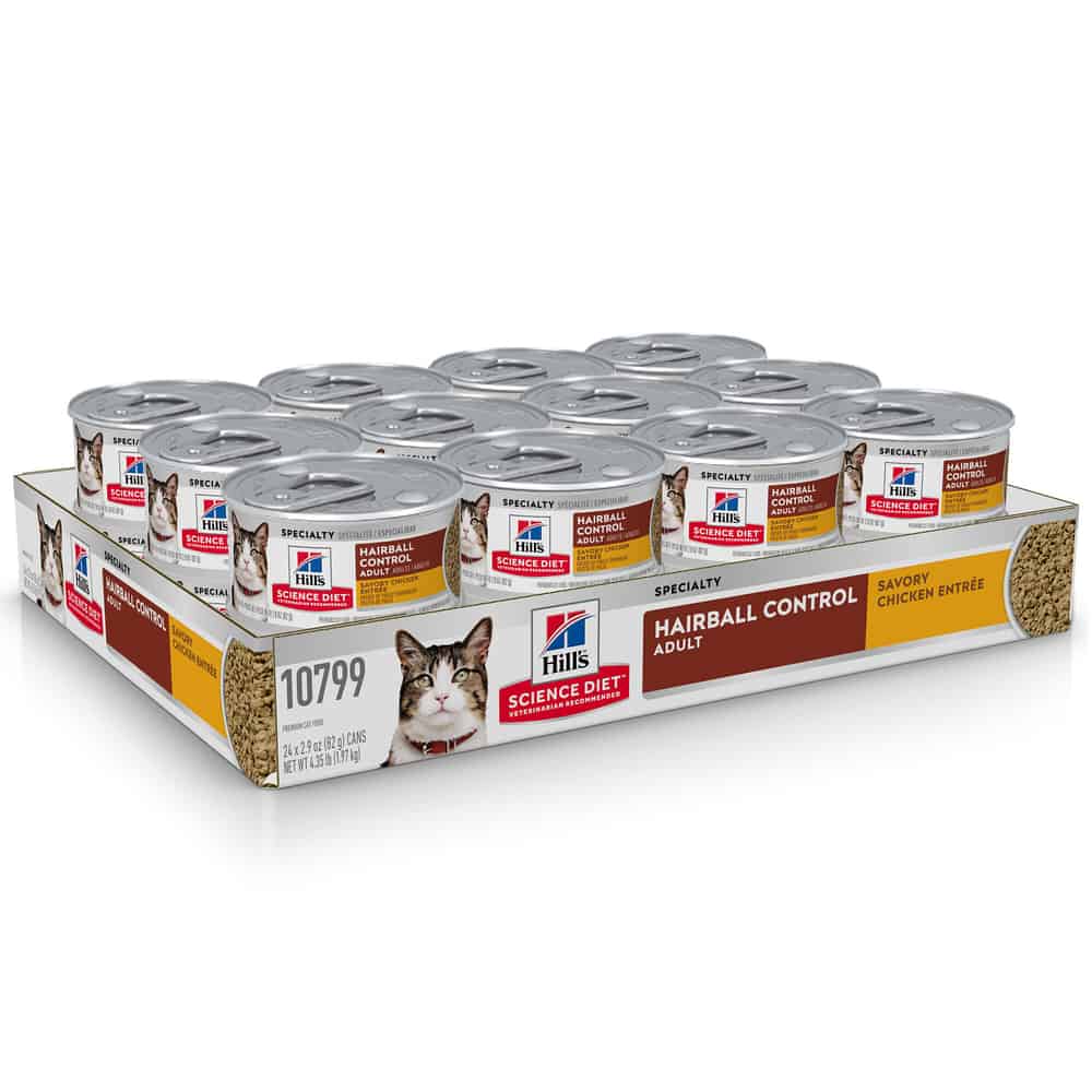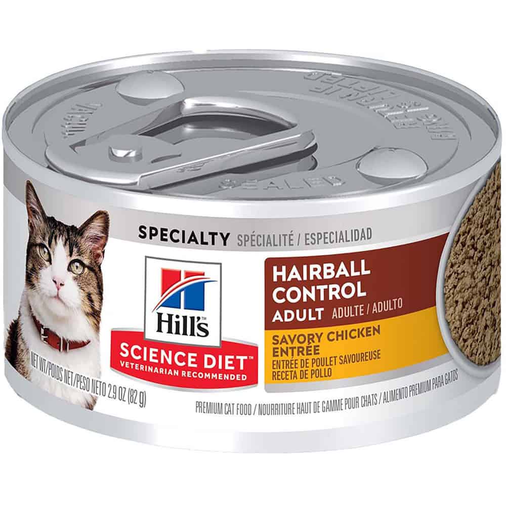 | Hill's Science Diet Adult Hairball Control Savory Chicken Entrée cat food is formulated to meet the nutritional levels established by the AAFCO Cat Food Nutrient Profiles for maintenance of adult cats. |