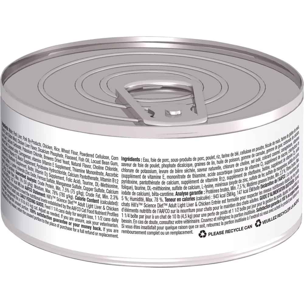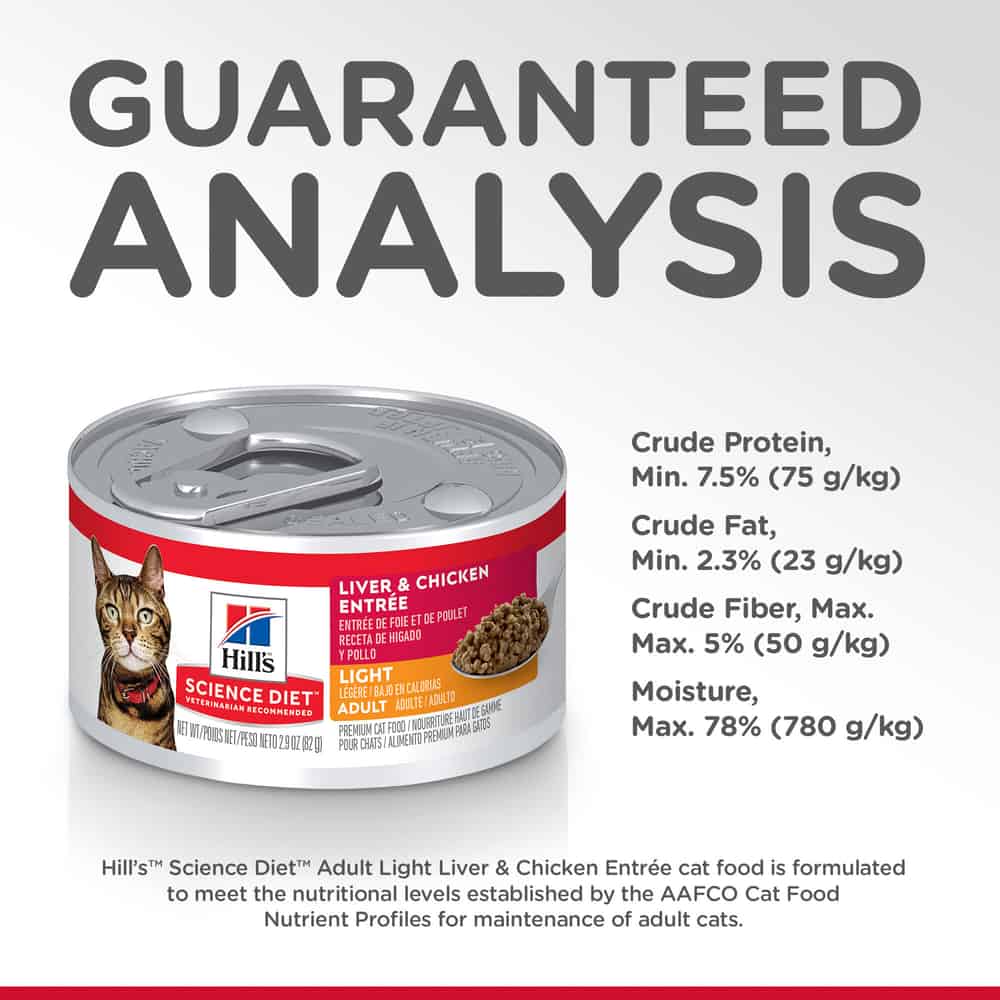 | Hill's Science Diet Adult Light Liver & Chicken Entrée cat food is formulated to meet the nutritional levels established by the AAFCO Cat Food Nutrient Profiles for maintenance of adult cats. |