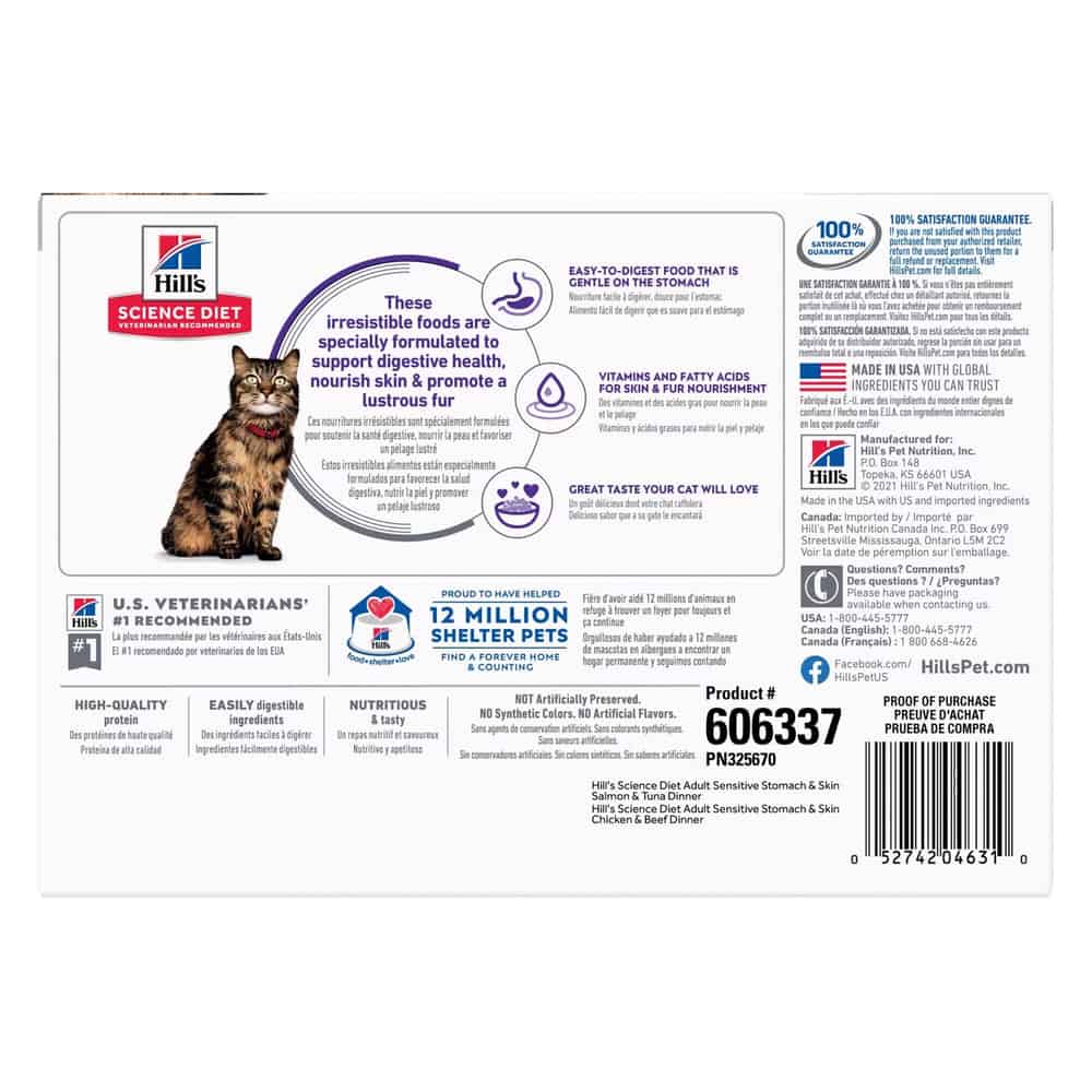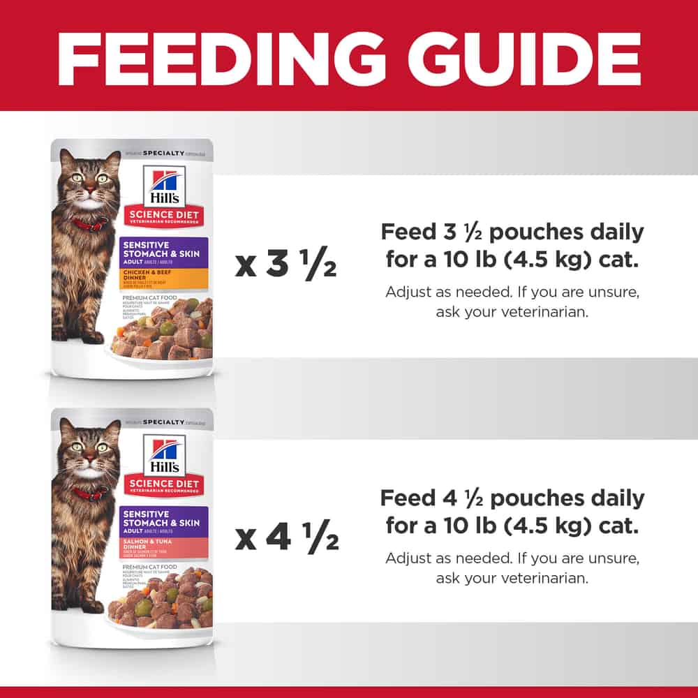 Hill's Science Diet Adult Sensitive Stomach & Skin Variety Pack, Chicken & Beef, Salmon, Tuna Wet Cat Food Pouches Directions: