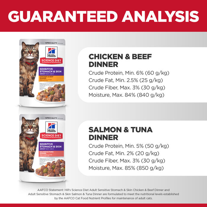 | Hill's Science Diet Adult Sensitive Stomach & Skin Chicken & Beef Dinner Cat Food is formulated to meet the nutritional levels established by the AAFCO Cat Food Nutrient Profiles for maintenance of adult cats. |