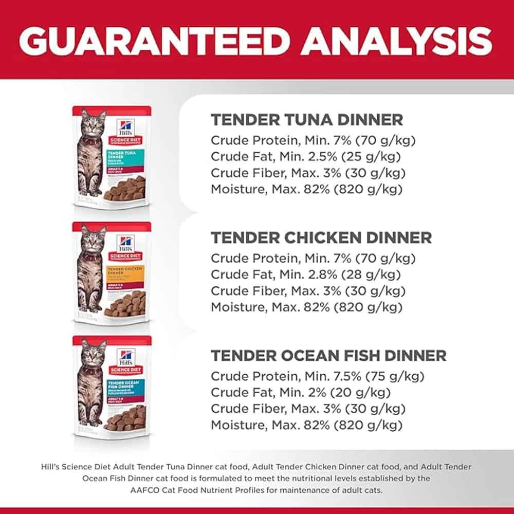 | Hill's Science Diet Adult Tender Tuna Dinner cat food is formulated to meet the nutritional levels established by the AAFCO Cat Food Nutrient Profiles for maintenance of adult cats. |