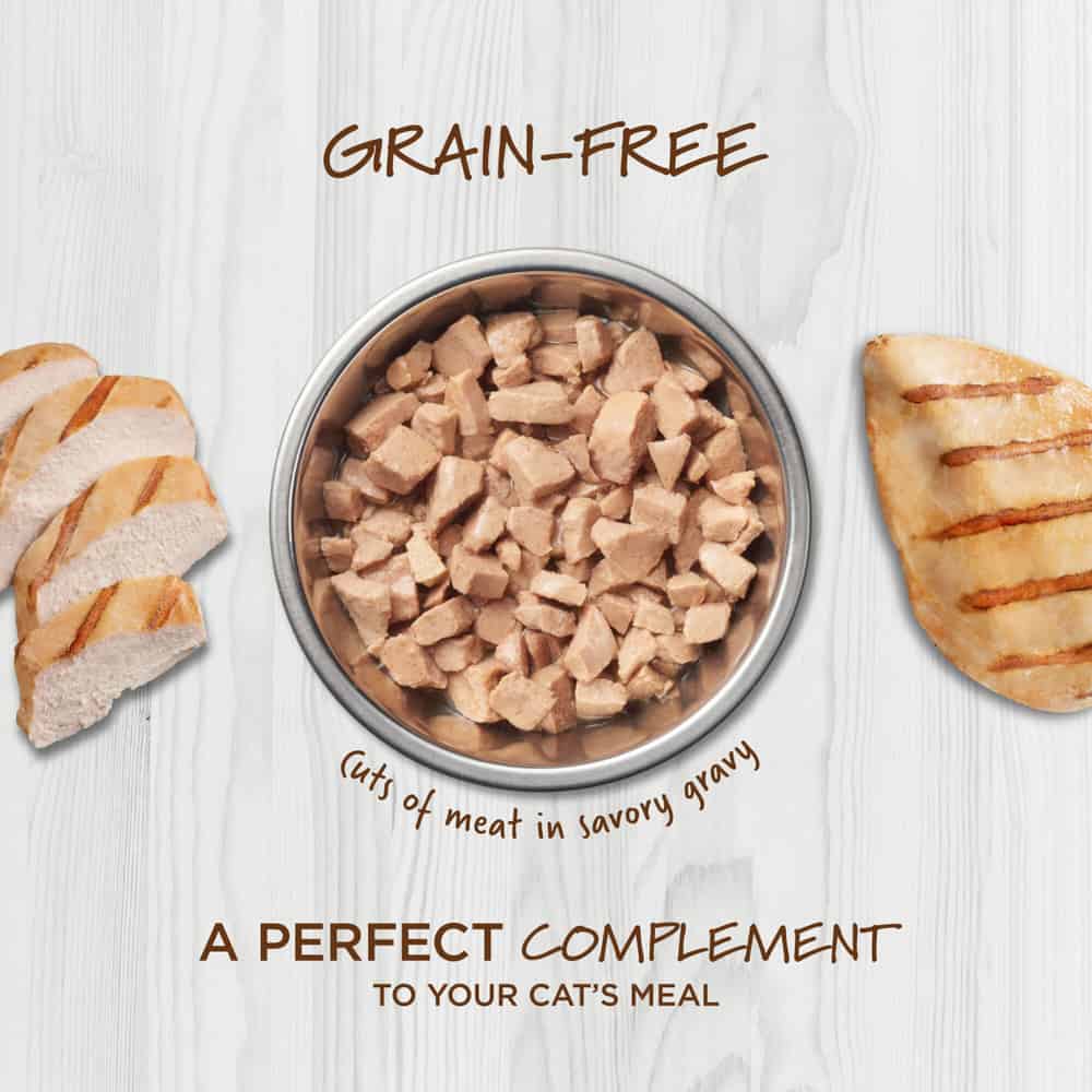 - Cuts of cage-free chicken in a savory gravy
