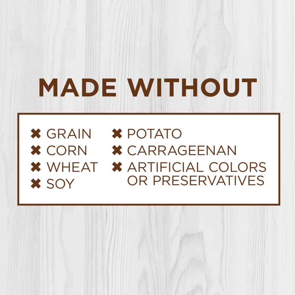 - Made without - grain, potato, corn, wheat, soy, by-product meal, artificial colors or preservatives
