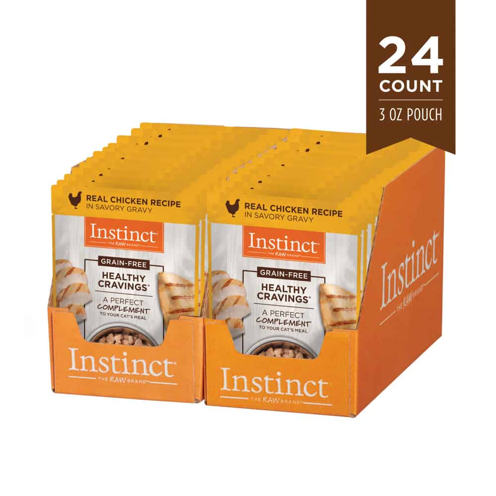 Let's face it. Our furry felines can be divas. If it's not the perfect food, they won't eat it. The newest way to turn even a boring meal into an exciting, tasty, protein packed savory dinner is with Instinct Healthy Cravings Grain-Free Tender Chicken Recipe Meal Topper Pouches for Cats. Made with real poultry in a flavorful sauce that your cat will enjoy, Instinct Healthy Cravings Grain-Free Tender Chicken Recipe Meal Topper Pouches for Cats are simple to add to your cat's usual diet for an extra boost of moisture, taste, and nutrition. Plus it's free of grains, gluten, and artificial flavors and preservatives.