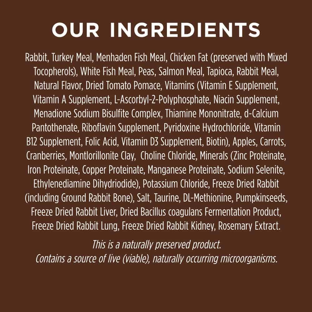 | Ingredients: Rabbit, Turkey Meal, Menhaden Fish Meal, Chicken Fat (preserved with Mixed Tocopherols and Citric Acid), Peas, White Fish Meal (Pacific Whiting, Pacific Sole, Pacific Rockfish), Tapioca, Salmon Meal, Rabbit Meal, Dried Tomato Pomace, Natural Flavor, Montmorillonite Clay, Vitamins (Vitamin E Supplement, L-Ascorbyl-2-Polyphosphate, Niacin Supplement, Thiamine Mononitrate, d-Calcium Pantothenate, Vitamin A Supplement, Riboflavin Supplement, Menadione Sodium Bisulfite Complex, Pyridoxine Hydrochloride, Vitamin B12 Supplement, Folic Acid, Vitamin D3 Supplement, Biotin), Carrots, Apples, Cranberries, Choline Chloride, Minerals (Zinc Proteinate, Iron Proteinate, Copper Proteinate, Manganese Proteinate, Sodium Selenite, Ethylenediamine Dihydriodide), Salt, Potassium Chloride, Freeze Dried Rabbit (including Freeze Dried Ground Rabbit Bone), DL-Methionine, Taurine, Pumpkinseeds, Dried Bacillus coagulans Fermentation Product, Freeze Dried Rabbit Liver, Freeze Dried Rabbit Lung, Freeze Dried Rabbit Kidney, Rosemary Extract |