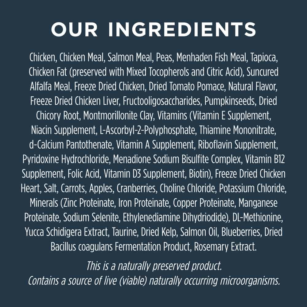 | Ingredients: Chicken, Chicken Meal, Chickpeas, Salmon Meal, Menhaden Fish Meal, Tapioca, Suncured Alfalfa Meal, Peas, Dried Tomato Pomace, Chicken Fat (preserved with Mixed Tocopherols and Citric Acid), Freeze Dried Chicken, Montmorillonite Clay, Natural Flavor, Freeze Dried Chicken Liver, Pumpkinseeds, Freeze Dried Chicken Heart, Potassium Chloride, Salt, Vitamins (Vitamin E Supplement, Niacin Supplement, L-Ascorbyl-2-Polyphosphate, Thiamine Mononitrate, d-Calcium Pantothenate, Vitamin A Supplement, Riboflavin Supplement, Menadione Sodium Bisulfite Complex, Pyridoxine Hydrochloride, Vitamin B12 Supplement, Folic Acid, Vitamin D3 Supplement, Biotin), Carrots, Apples, Cranberries, Choline Chloride, DL-Methionine, L-Carnitine, Minerals (Zinc Proteinate, Iron Proteinate, Copper Proteinate, Manganese Proteinate, Sodium Selenite, Ethylenediamine Dihydriodide), Taurine, Dried Kelp, Salmon Oil, Blueberries, Dried Bacillus coagulans Fermentation Product, Rosemary Extract |