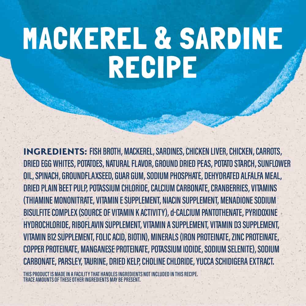 | Ingredients: Fish Broth, Mackerel, Sardines, Chicken Liver, Chicken, Carrots, Dried Egg Whites, Ground Dried Peas, Potato Starch, Potatoes, Natural Flavor, Guar Gum, Sunflower Oil, Ground Flaxseed, Salmon Meal, Dehydrated Alfalfa Meal, Dried Beet Pulp, Potassium Chloride, Calcium Carbonate, Cranberries, Sodium Acid Pyrophosphate, Tetrasodium Pyrophosphate, Minerals (Iron Proteinate, Zinc Proteinate, Copper Proteinate, Manganese Proteinate, Potassium Iodide, Sodium Selenite), Sodium Carbonate, Vitamins (Vitamin E Supplement, Thiamine Mononitrate, Niacin, Menadione Sodium Bisulfite Complex (Source Of Vitamin K Activity), D-Calcium Pantothenate, Pyridoxine Hydrochloride, Riboflavin Supplement, Vitamin A Supplement, Vitamin D3 Supplement, Vitamin B12 Supplement, Folic Acid, Biotin), Spinach, Parsley, Dried Kelp, Choline Chloride, Taurine, Sodium Phosphate, Sodium Hexametaphosphate, Thiamine Mononitrate, Dl-Methionine, Yucca Schidigera Extract |