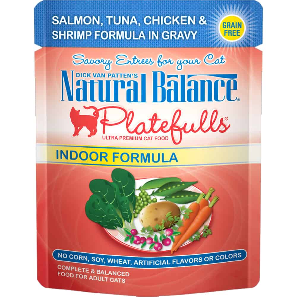 What is Natural Balance® Original Ultra™ Platefulls® Indoor Salmon, Tuna, Chicken & Shrimp Recipe in Gravy Wet Cat Food?