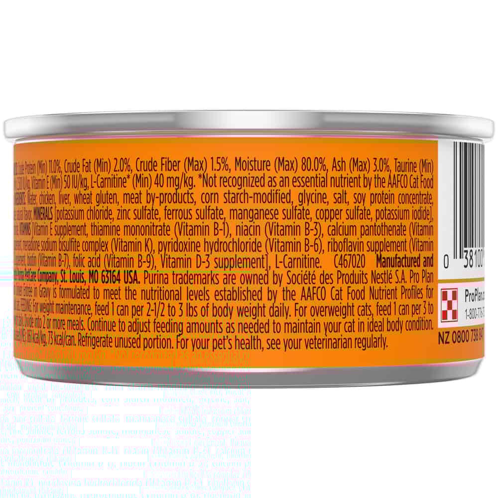 Provide your cat with focused nutrition to meet their unique needs when you serve them Purina Pro Plan Specialized Healthy Metabolism Formula Chicken Entree in Gravy adult wet cat food. Every high-quality ingredient in this high protein wet cat food is carefully selected for a specific purpose. A rich gravy and tender bites enrich the mealtime experience and give them something to love about this premium cat food, which contains no artificial colors or preservatives. Fill their dish with Purina Pro Plan Specialized Healthy Metabolism Formula adult wet cat food, and nurture the greatness in your cat companion with every can. Purina proudly manufactures this weight management cat food in Purina-owned, U.S. facilities.
