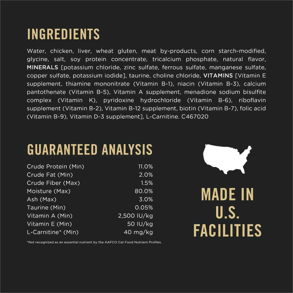 | Water, Chicken, Liver, Wheat Gluten, Meat By-Products, Corn Starch-Modified, Glycine, Salt, Soy Protein Concentrate, Tricalcium Phosphate, Natural Flavor, MINERALS [Potassium Chloride, Zinc Sulfate, Ferrous Sulfate, Manganese Sulfate, Copper Sulfate, Potassium Iodide], Taurine, Choline Chloride, VITAMINS [Vitamin E Supplement, Thiamine Mononitrate (Vitamin B-1), Niacin (Vitamin B-3), Calcium Pantothenate (Vitamin B-5), Vitamin A Supplement, Menadione Sodium Bisulfite Complex (Vitamin K), Pyridoxine Hydrochloride (Vitamin B-6), Riboflavin Supplement (Vitamin B-2), Vitamin B-12 Supplement, Biotin (Vitamin B-7), Folic Acid (Vitamin B-9), Vitamin D-3 Supplement], L-Carnitine. C467020 |