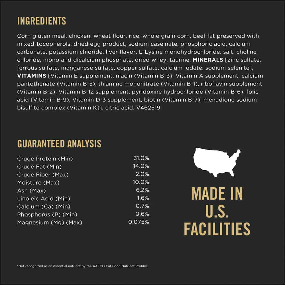 | Corn Gluten Meal, Chicken, Wheat Flour, Rice, Whole Grain Corn, Beef Fat Preserved With Mixed-tocopherols, Dried Egg Product, Sodium Caseinate, Phosphoric Acid, Calcium Carbonate, Potassium Chloride, Liver Flavor, L-lysine Monohydrochloride, Salt, Choline Chloride, Mono And Dicalcium Phosphate, Dried Whey, Taurine, Minerals [Zinc Sulfate, Ferrous Sulfate, Manganese Sulfate, Copper Sulfate, Calcium Iodate, Sodium Selenite], Vitamins [Vitamin E Supplement, Niacin (Vitamin B-3), Vitamin A Supplement, Calcium Pantothenate (Vitamin B-5), Thiamine Mononitrate (Vitamin B-1), Riboflavin Supplement (Vitamin B-2), Vitamin B-12 Supplement, Pyridoxine Hydrochloride (Vitamin B-6), Folic Acid (Vitamin B-9), Vitamin D-3 Supplement, Biotin (Vitamin B-7), Menadione Sodium Bisulfite Complex (Vitamin K)], Citric Acid. V462519 |