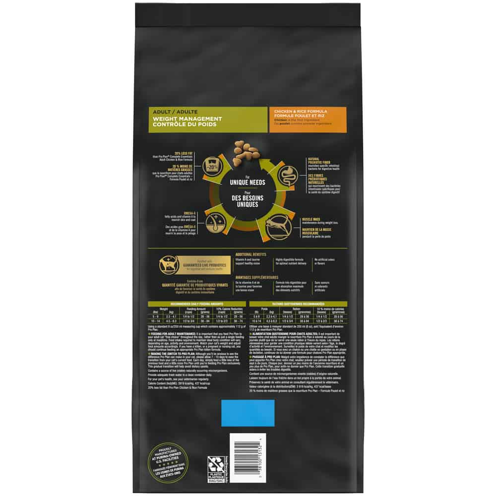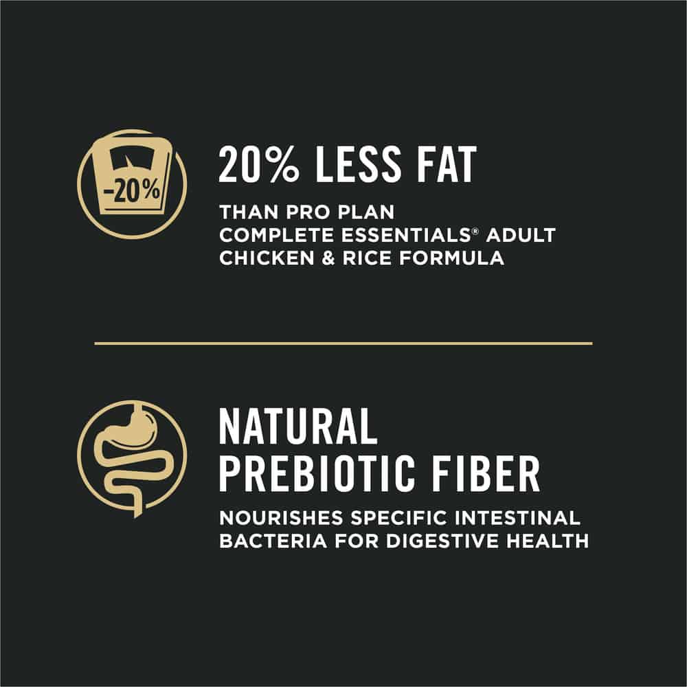 - 20 percent less fat than Pro Plan COMPLETE ESSENTIALS Adult Chicken and Rice Formula.
